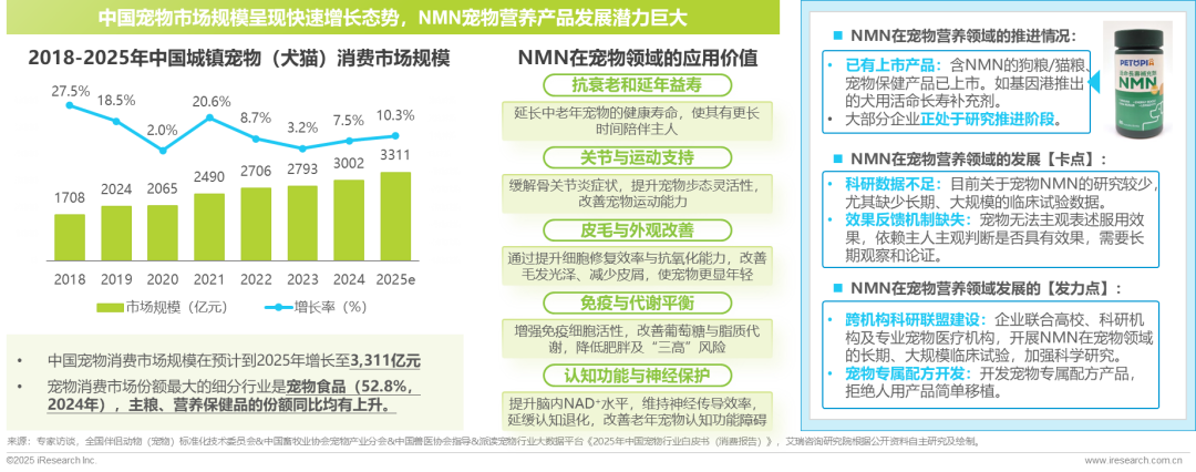 中国宠物经济市场规模近年快速增长,在2024年突破3,000亿元,增长率到7.5%,其中份额最大的细分市场为宠物食品(占比52.8%),宠物主粮和营养保健品的份额均呈现上升趋势。NMN在宠物营养健康方面,具备抗衰老延寿、改善细胞能量代谢、提升运动能力、改善皮肤毛发健康等多元价值,目前已有含NMN的宠物营养产品上市。未来发展应聚焦科研数据积累、宠物专属配方产品创新等方面,推动NMN在宠物领域健康发展。