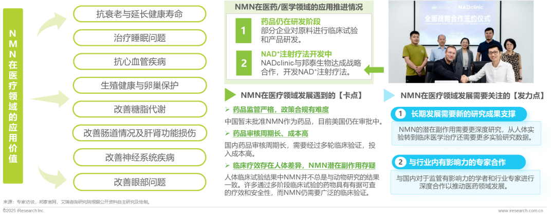 NMN在医疗领域的应用价值多样,主要体现在以下八个方面:抗衰延寿、治疗睡眠问题、抗心血管疾病、生殖健康维护与卵巢保护、改善代谢、肠道肝肾调节、神经疾病与眼部问题。目前NMN药品仍在研发阶段,已有企业正在推进NAD+注射疗法的研究,未来或可延伸至NMN注射治疗。但NMN在医疗领域发展面临药品审核周期长且成本高、监管趋严且政策合规难、临床科学研究数据不足的卡点。未来发展需深度临床研究支撑安全性和疗效,并协同权威行业专家推动监管突破与产业规范。