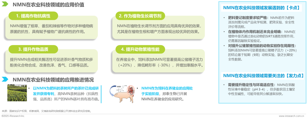 NMN在农业科技领域展现出多重应用价值:可提升作物的抗病性,作为生长调节剂促进植物生根增产,改善茶叶香气与品质,并在养殖业中提高公猪精子活力和繁殖性能。目前,高NMN茶树品种已完成研发并获得专利,而NMN饲料在养殖业仍处实验阶段。NMN在农业科技领域的发展面临着肥料登记制度严格,植物体内作用机制未明确,动物实验缺乏长期安全性数据等卡点。未来需重点关注NMN的环境适应性,解决NMN在碱性土壤中分解加速的问题,以提升稳定性。