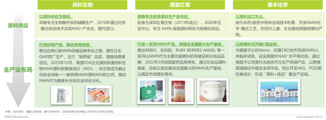 在企业层面而言,NMN相关企业获得长远发展的核心突破点在于积极推动商业模式创新转型,从单一的原料供应商角色向覆盖全产业链的综合服务商跃升。业内已有尚科生物、康盈红莓、雅本化学等领先企业通过延伸产业链,构筑起自身的优势壁垒和品牌价值。通过构建“原料+成品”的复合业务模式,企业不仅能够更好地把控产品的质量和成本,更能直接触达消费者需求,建立品牌认知,并在未来市场拓展进程中占据更主动的地位。