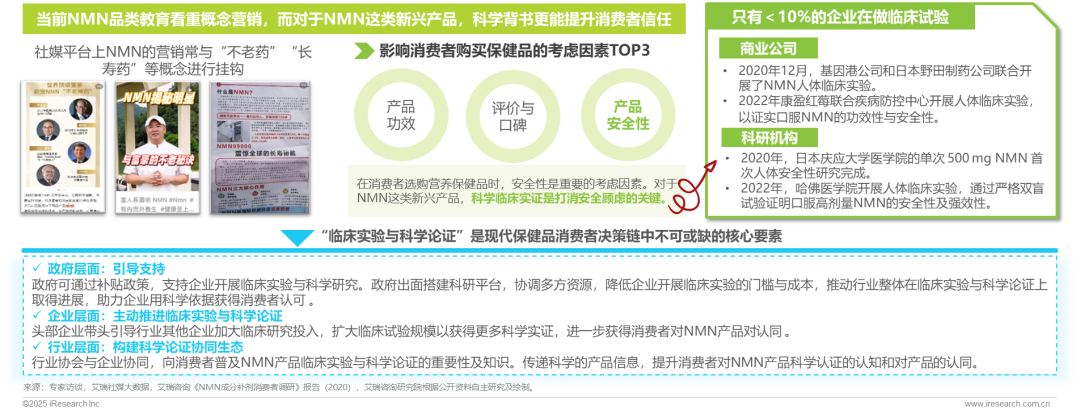 NMN目前仍然处于市场教育的初期阶段,未来需要从聚焦“概念营销”的营销惯性转向坚实的“临床验证”与“科学背书”。然而,行业现状显示,投入人体临床试验的企业比例不高于10%,这成为制约市场信心的关键瓶颈。未来,企业需要加大临床投入,以严谨的科学数据为产品提供有力支撑,并以此为基础开展深入的品类教育。同时,亟需政府引导支持与行业协同共建科学验证生态,共同推动NMN及相关产品从“概念”走向“实证”,最终赢得消费者的广泛认可和信任。
