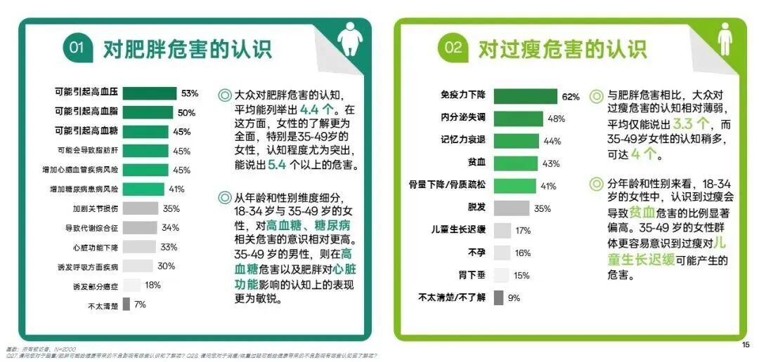 同时,大众对体重健康的认知仍有短板:多数人依靠视觉感受评估体重,能认识到肥胖可能引起高血压、高血脂和血糖,平均能列举出4.4个危害。
