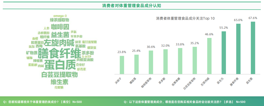 在消费者关注的体重管理成分调研中,膳食纤维、益生菌、蛋白质等营养成分备受关注;白芸豆提取物、奇亚籽提取物、绿茶提取物等植物来源成分也获得广泛认可。此外,左旋肉碱、茶多酚等小分子化合物,更是当下体重管理领域的热门明星成分。