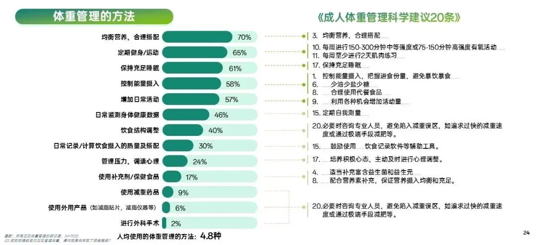 益普索Ipsos的数据显示,55%的大众正在积极进行体重管理,其中70%已将其融入日常生活。从均衡营养、定期运动到控制能量摄入,大众人均尝试4.8种体重管理方法,但“效果难显”、“工作学习忙”、“缺乏系统性知识”、“难抵美食诱惑”等问题,让76%的人直呼体重管理“知易行难”。而这一痛点,也催生了中国体重管理市场的蓬勃发展,让科学的体重管理产品和方案,成为市场的核心需求。