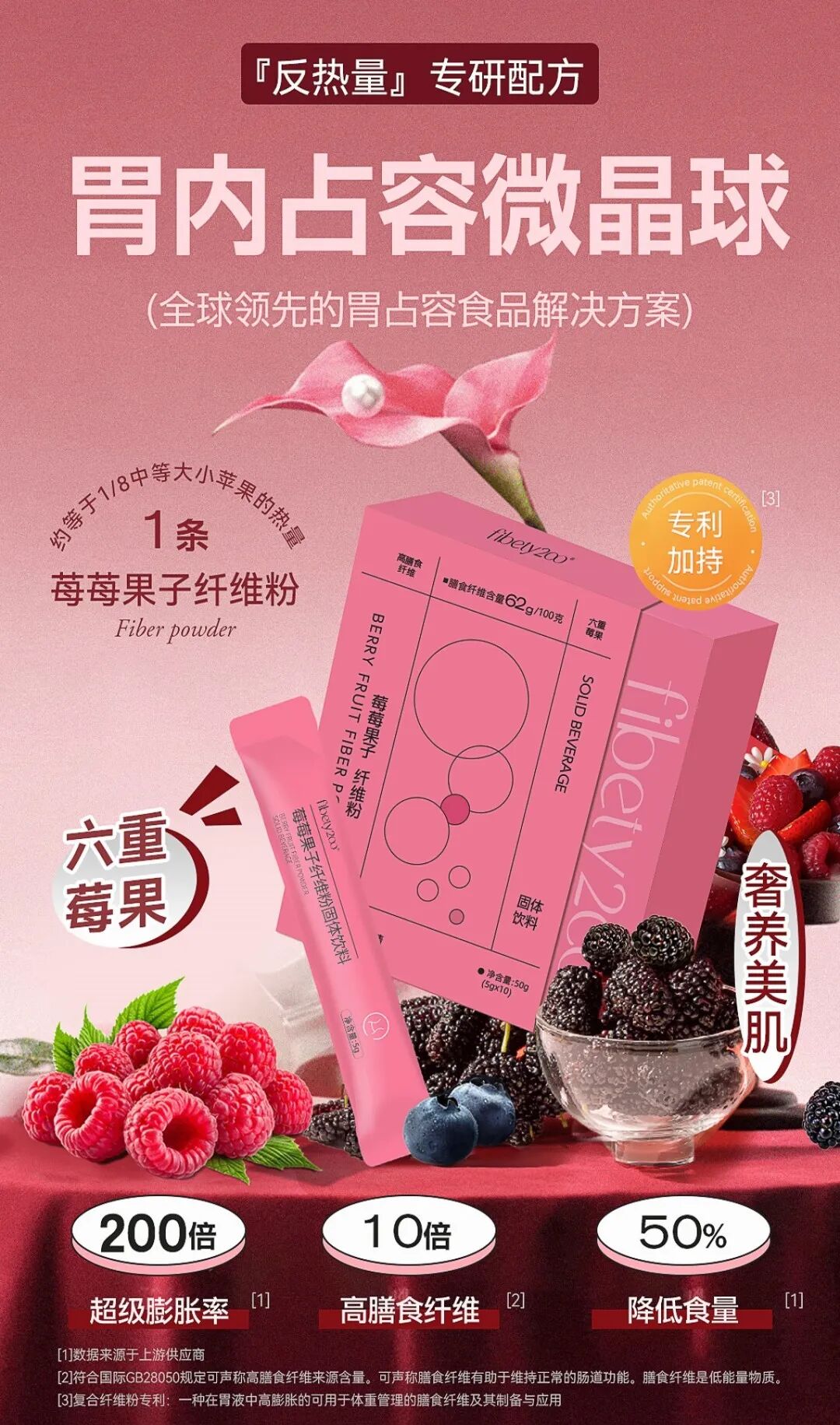 ②每袋添加1.5gFibGel®超级植物基膳食纤维,膨胀率200倍,饮食量-50%,8h完全排出体外。