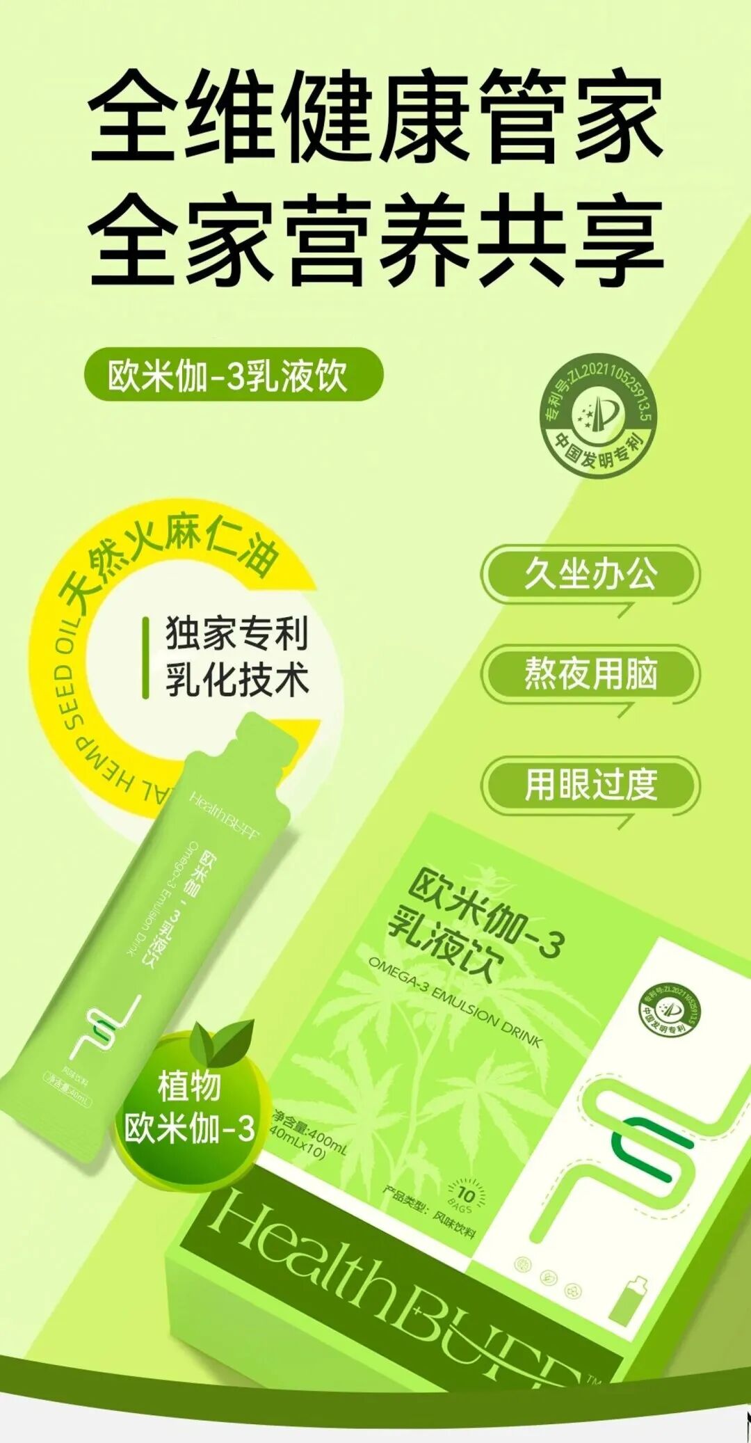 ①100%纯植物萃取,主要配料为火麻仁油,每袋含Omega-3为3g,精准补充,平衡身体脂肪酸。