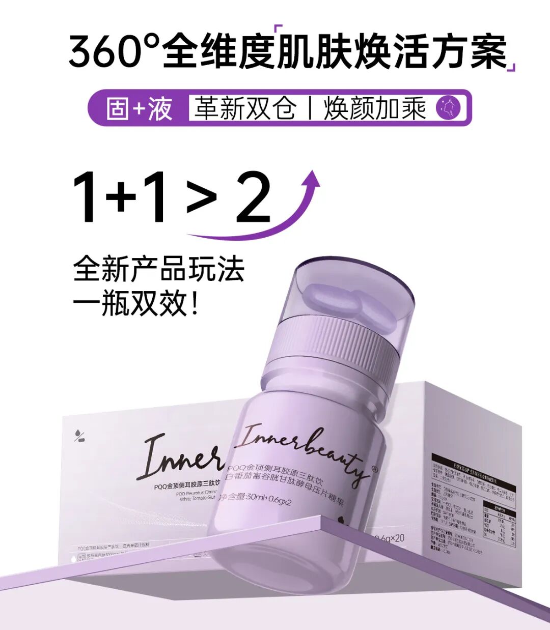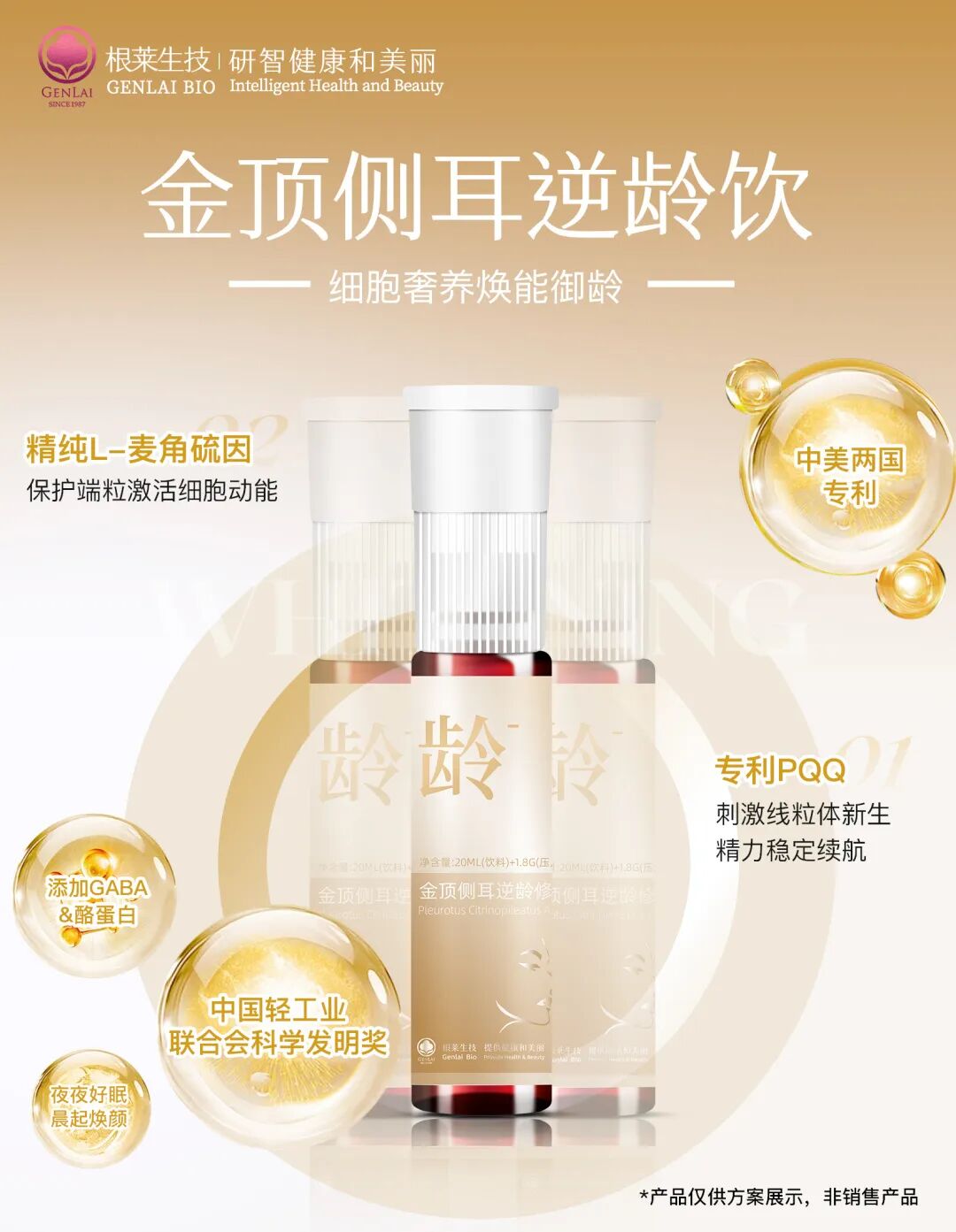 采用独特的上下双舱设计,下层是夜间饮,含GABA和酪蛋白肽,帮助深度修护与好眠;上层是日间焕能片,核心是专利金顶侧耳提取物(含珍稀L-麦角硫因) 和专利PQQ,白天激活细胞、保护端粒、促进线粒体新生。日夜接力,实现‘夜修日焕’的全天候抗衰闭环。