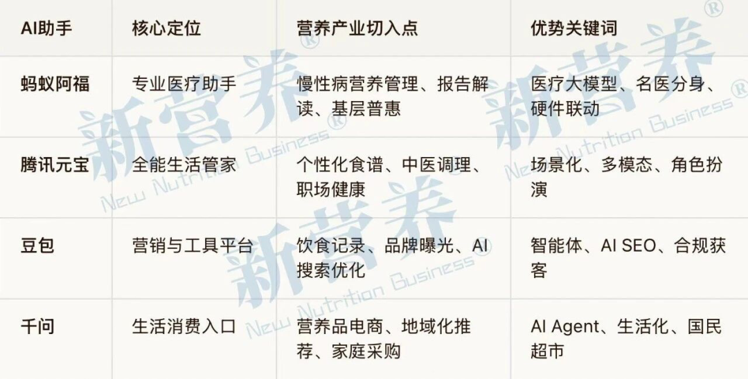 随着蚂蚁阿福、腾讯元宝、阿里千问、字节豆包等AI大模型的加速入场,营养产业正在经历一场前所未有的技术革命。这些智能平台不仅改变了产品研发和营销方式,更重新定义了健康服务的交付模式。