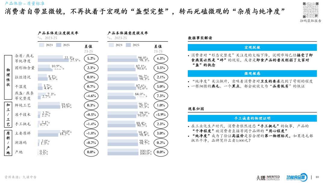 下篇最重要的判断之一是:用户不再执着“盏型完整”,而是开始死磕更微观、也更难糊弄的东西——杂质、燕毛、黑点、干净。纯净度关注度提升 +5.2%。