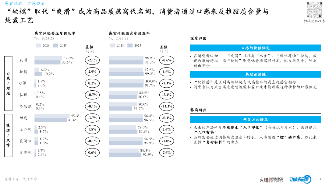 报告建议把“被剥夺感”的解法做成两条可量化的指标:软糯指数 + 纯净标准;并给出数据依据——“软糯”满意度 99.2%,“纯净度”关注度 +5.2%。