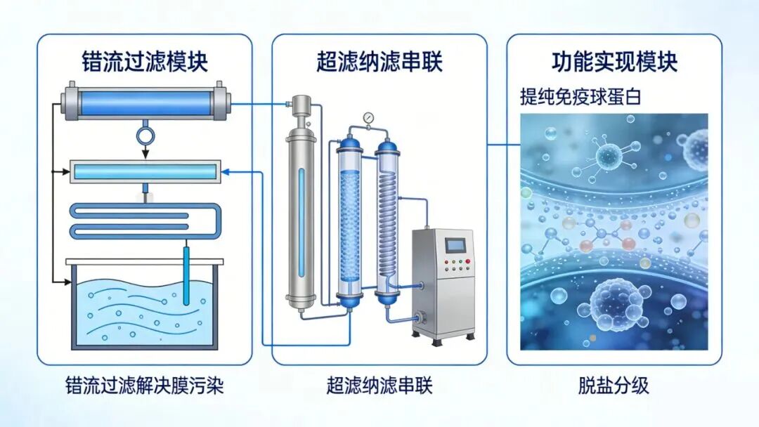 膜分离技术的集成应用:膜分离技术不仅仅用于浓缩,还发展出了“错流过滤”等先进模式,能有效解决膜污染问题,提高分离效率。通过将超滤与纳滤技术串联,不仅可以提纯免疫球蛋白,还能实现脱盐和分级,为后续的食品加工提供更优质的原料。