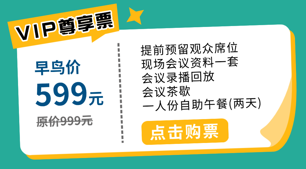 免费报名享现场会议资料、会议茶歇 付费升级VIP还可解锁 录播回放、自助午餐、预留席位等 尊享更多权益
