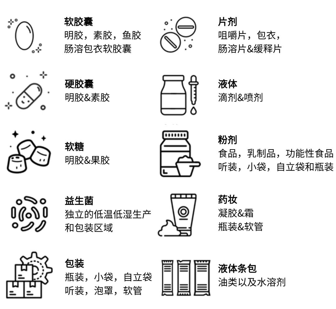 澳药集团的产品涵盖软胶囊,Vegan植物软胶囊,片剂,明胶硬胶囊,植物硬胶囊,粉剂,液体,凝胶,软糖,益生菌,泡腾片等多个剂型。